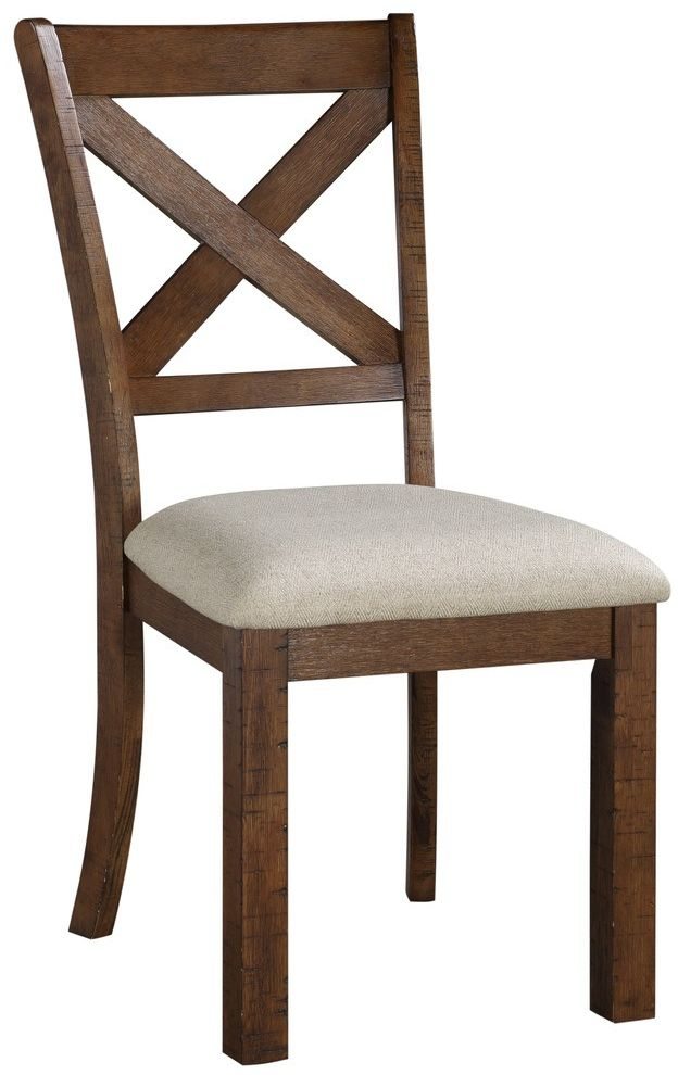 Solid pine lays a foundation for the acacia veneer of the group, with a brown finish lending highlight to the distinct veneer pattern. This wood-framed chair features an X-back and beige-hued fabric seat.Read More