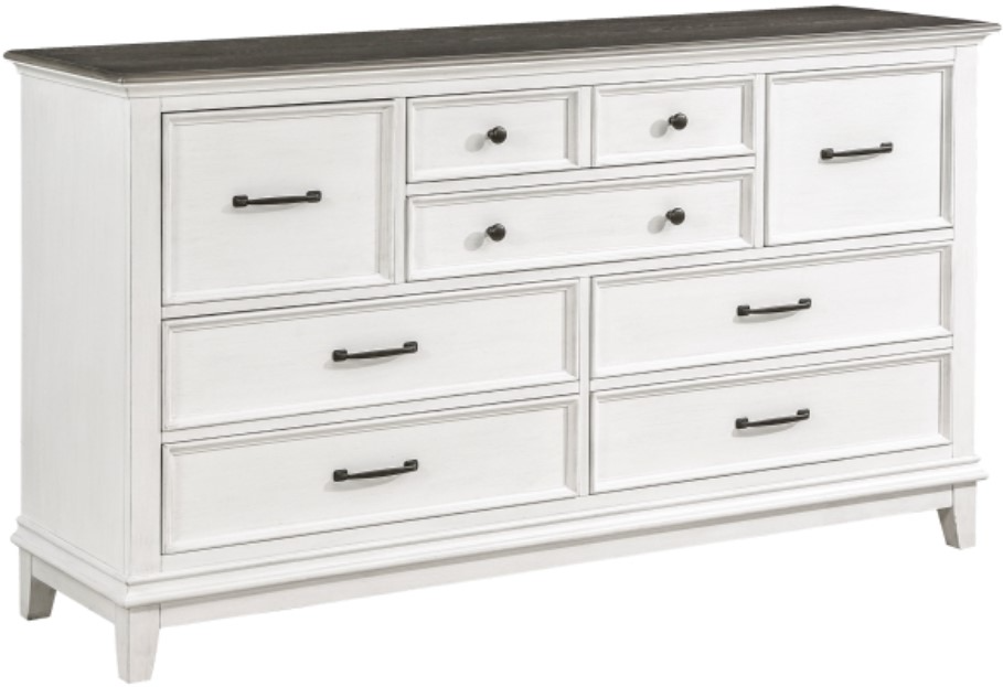 The knob and bar hardware that fronts the drawers of the dresser provide distinct complementing contrast to the collection’s finish.