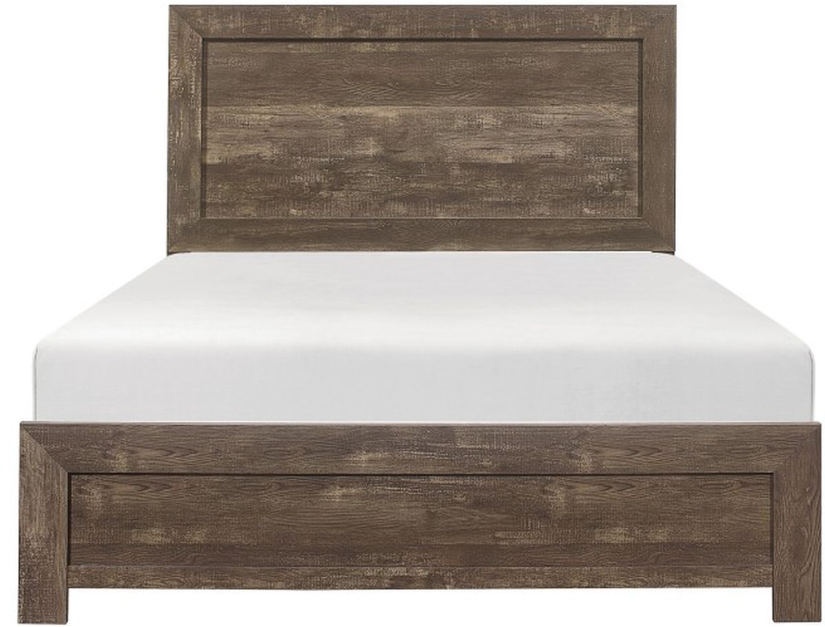 Modern lines and rustic styling are paired to create the look of the Corbin Collection. The embossed faux-wood veneer’s texture is highlighted by a rustic brown finish for a realistic wood look. Subtle framing defines the profile of the Queen panel headboard and footboard, further lending to the unfettered design of the collection. The bed’s construction allows for convenient packaging within one box.