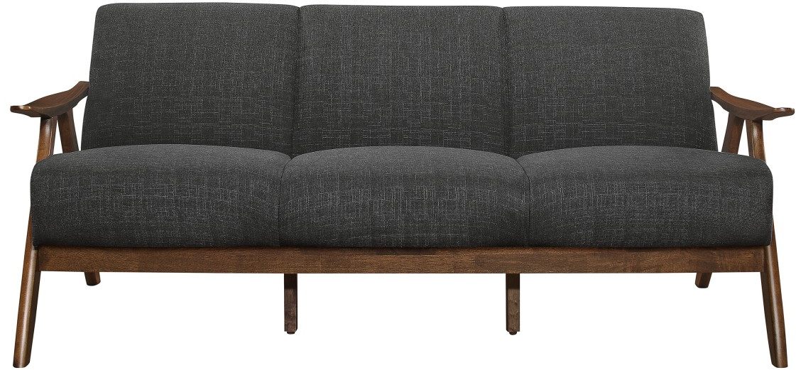 The retro-inspired wood framing of the Damala Collection will perfectly accent your modern home décor. Subtle contouring to the sofa’s wood frame is finished in walnut, presenting as a classic complement to the dark gray fabric that covers the padded sofa’s seat and back.