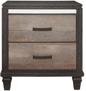 Rustic style is paired with modern accent to create the bold look of the Danridge Collection. Paper laminate veneer presents a realistic wood-look with brown and cappuccino blending to create the two-tone finish. Antiqued brass finish hardware fronts the drawers of the nightstand and a mirrored strip provides decorative accent.