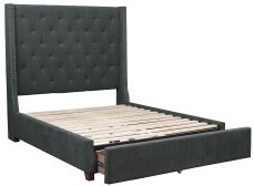 The Eastern King mansion headboard features nail head accent and button tufting creating a modern traditional look that defines your personal style. Gray fabric covers the bed, providing neutral complement to your decorative bedding. Providing additional function to the bed is the footboard which extends to expose drawer space.Read More