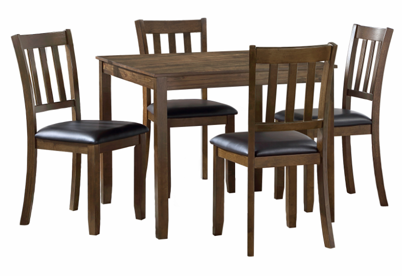 Scaled for your casual dining nook, the transitionally styled Faust Collection will provide the perfect complement to your home’s decor.Vertical slat-back wood-framed chairs feature dark brown faux leather seating that pair with the coordinating table.Read More