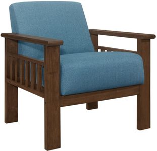 Providing accent to the transitional surroundings of your home is the Helena Collection. Styled with a nod to the Arts & Crafts era, the chair’s solid wood construction features a walnut finish, blue fabric upholstery and vertical slat accent on the arms.Read More