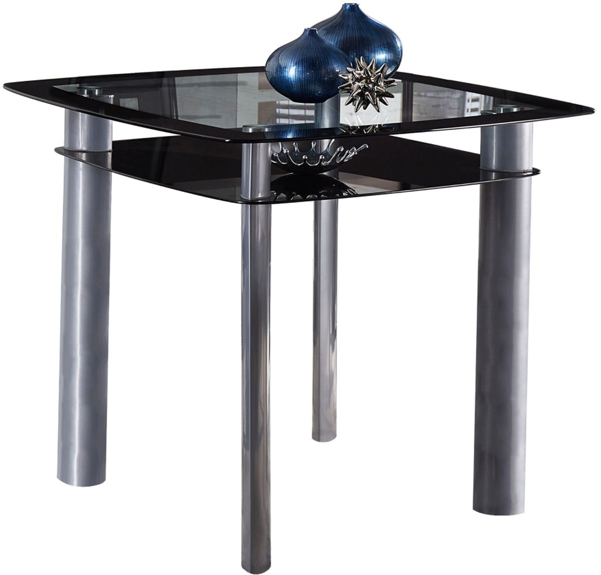 This dining group has silver finished metal table legs that support the dual glass platforms – the dining surface features clear glass with black framing while the lower display shelf features black glass providing contrast and a finish that lends a modest touch to the over-the-top design of this dining set.Read More