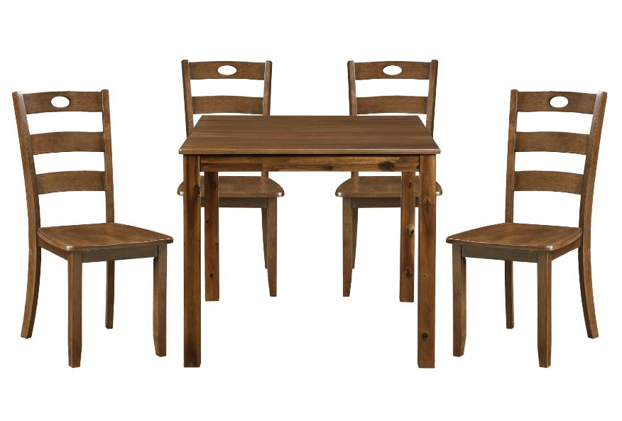 The Stowe Collection offers a conveniently paired 5-piece table and dining chairs to complete the look of your casual dining space. The transitional style of the collection features a walnut finish over the distinct grain of the acacia veneer, and a classic profile. The chairs have keyhole detail on the top rail and wood seats.Read More