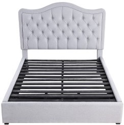 The full upholstered bed’s profile is defined by nailhead trim, features button-tufting and is covered in gray linen-like fabric for neutral accent to your bedroom’s decor. The platform bed’s low-profile footboard conveniently pulls out to reveal a storage drawer, providing functional space to store your essentials.Read More
