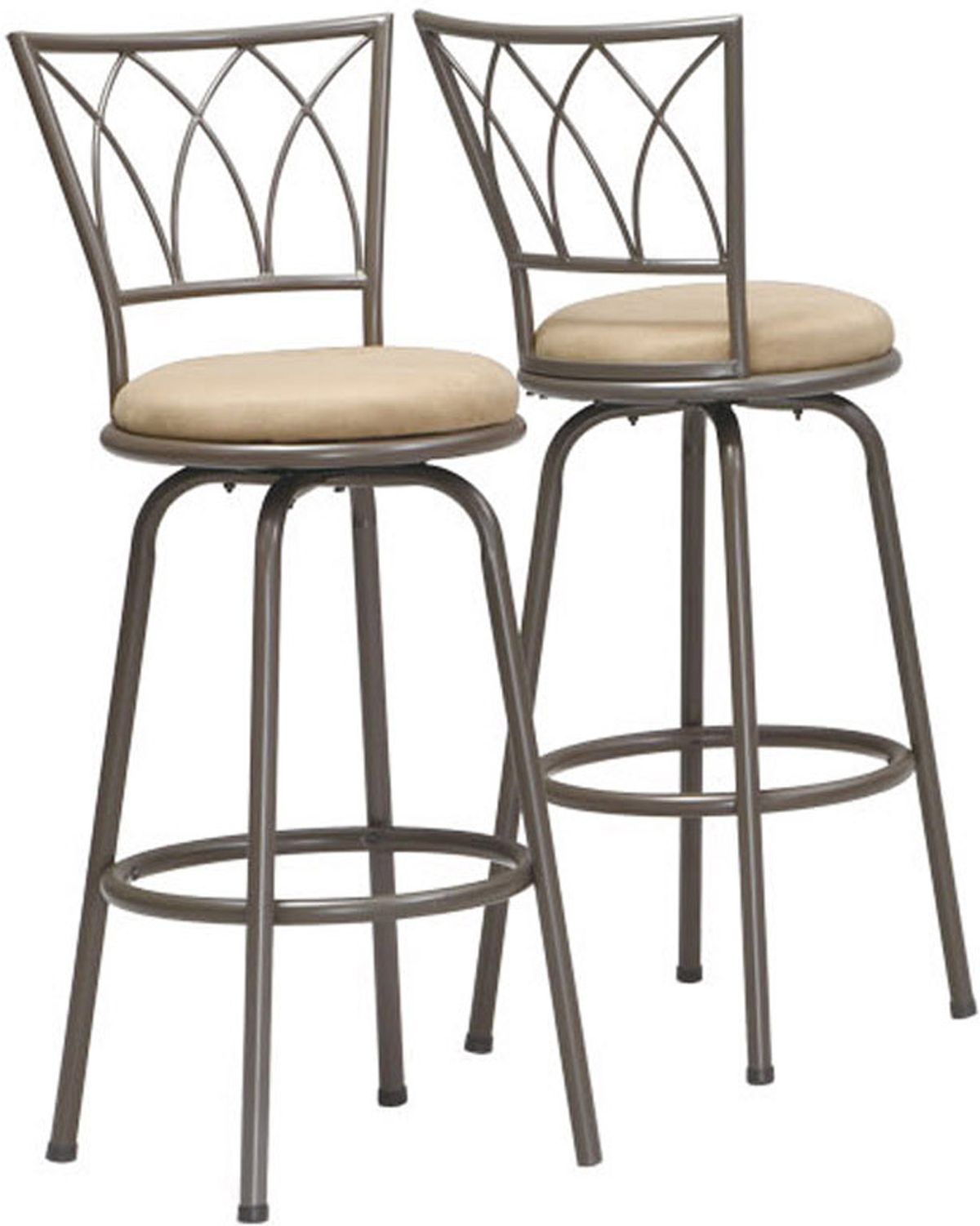 This sleek and contemporary set of 2 metal bar stools finished in a dark coffee colour is perfect for all types of entertainment and dining spaces. With a slightly curved high back in a cathedral window design, comfortably cushioned beige microfiber 360 degree pivoting seat and well positioned footrest, this swivel bar stool set is sure to be a staple for many memorable evenings with friends and family. Easy to assemble.
