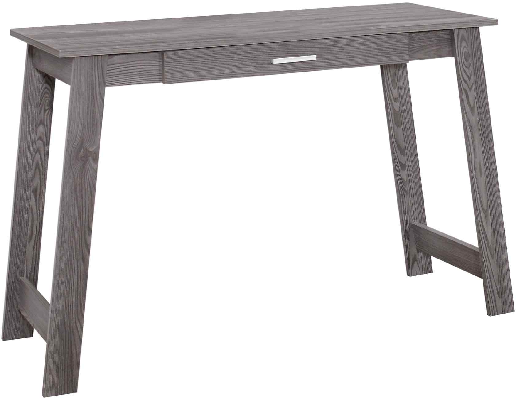 This simply designed, contemporary style rectangular desk with an elegant grey wood-look finish, is perfect for any space in your home. This versatile desk with sturdy angular legs has plenty of room for a laptop, a lamp, books or office essentials, and the single storage drawer accented with a sleek silver handle is useful for papers and office supplies. Easily suitable in a home office, a hallway or in a living room, this computer/writing desk brings practicality and style to small spaces.