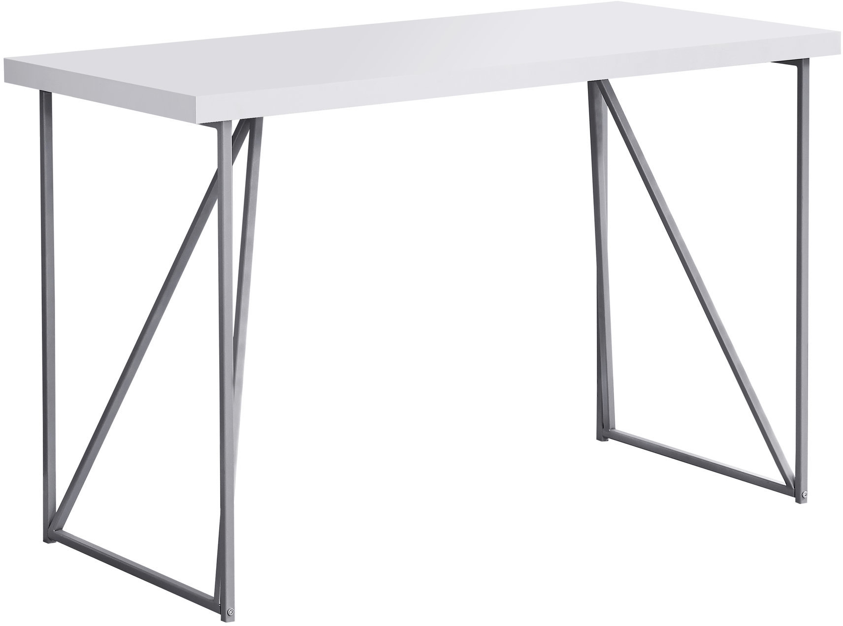 Simplicity, style, and function are brought together in this chic, contemporary computer desk in a bold glossy white finish. The spacious thick laminated top constructed from high quality MDF is ideal for a laptop, office supplies, books, or a lamp. The strong silver metal legs with triangle shaped support bars on both sides adds an interesting æsthetic to the modern design. This versatile, compact desk finished on all sides is useful for all your work tasks, and makes a big impact even in the smallest spaces. Assembly is required.