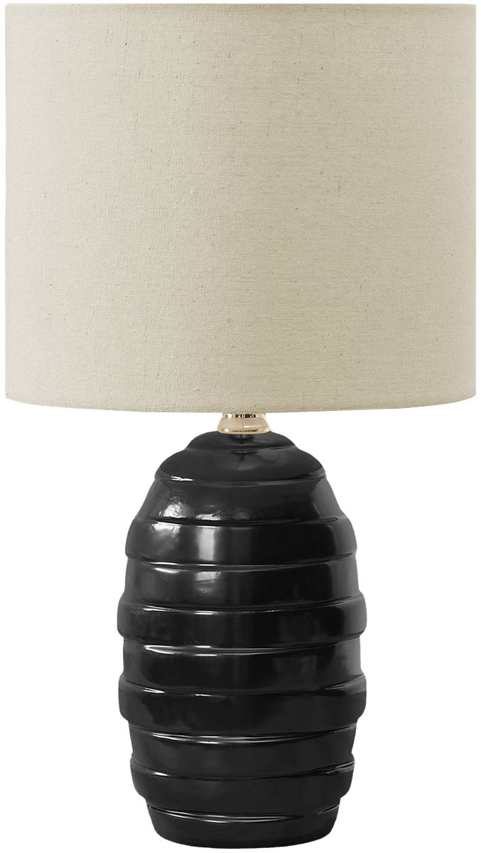 The classic, vase shaped textured finish base is topped with an elegant ivory fabric shade to softly diffuse the light and create a warm and inviting ambiance whether placed on a nightstand, end or side table. With a convenient on/off turn knob switch for a 60W standard bulb (not included), this lamp will instantly brighten a dim corner. Backed by a 2 year limited warranty against manufacturer defects, you can trust that this fashionable and trendy accent lighting piece is built to last. Illuminate your home with contemporary elegance and let this ceramic table lamp be the stylish centerpiece that completes your decor vision.