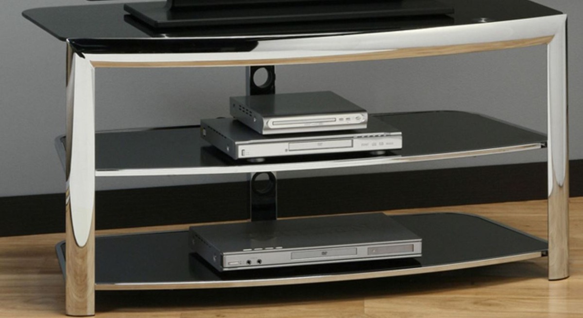 The black tempered glass finish is an easy-to-clean TV table surface