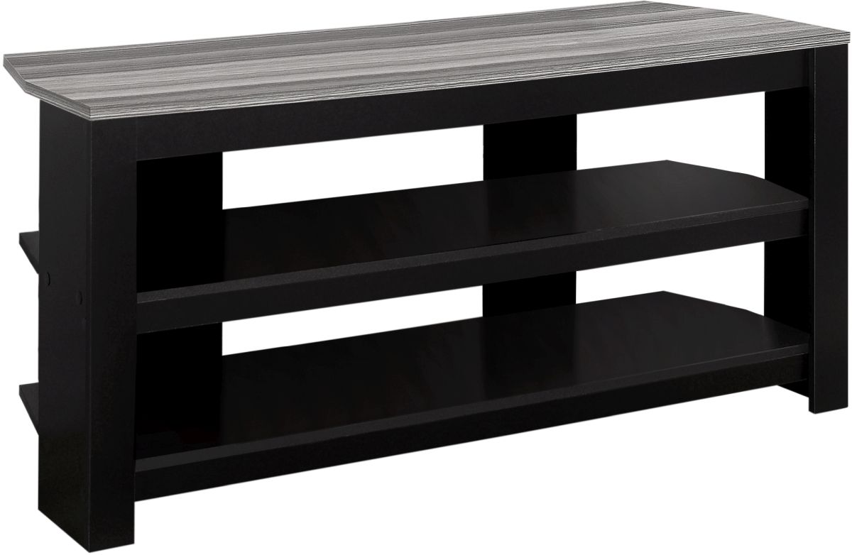 Enhance the look of your contemporary living space with this corner concept TV stand. Constructed with thick panels in an elegant grey wood grain look top and black finish, this TV stand can be used against any wall or will perfectly fit into a corner as a great space saving solution. With two fixed open concept shelves ideal for your media storage needs, this TV stand is a must have for any home. Accommodates all TV sizes with a center stand.
