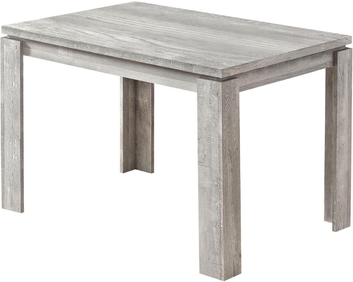 Looking for rustic? Looking for contemporary? How about both? This gray wash thick-paneled kitchen table features a unique reclaimed wood surface to offer you the perfect farmhouse style for your new place. The modern dining table also features open block shaped legs to keep everything nice and sturdy. When it's time to make a statement in your home, count on this kitchen table to do the job in a casual or formal dining setting. Chairs sold separately.