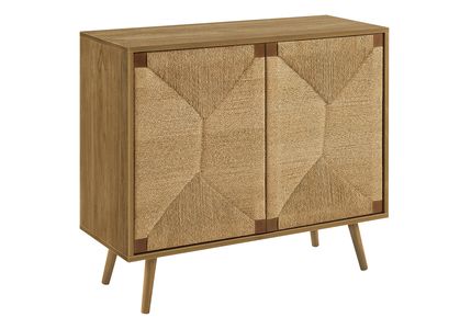 This 36" wide accent chest in a mid-century design and a light walnut laminate finish, features seagrass-look cabinet doors that effortlessly combines décorative elegance with practical storage