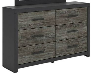 The Broachmyn 6-drawer dresser offers a striking two-tone finish with matte black framing and weathered gray oak-grain fronts. Its framed panels, pilasters, and large dark pulls blend bold contrast with refined, functional storage.Read More