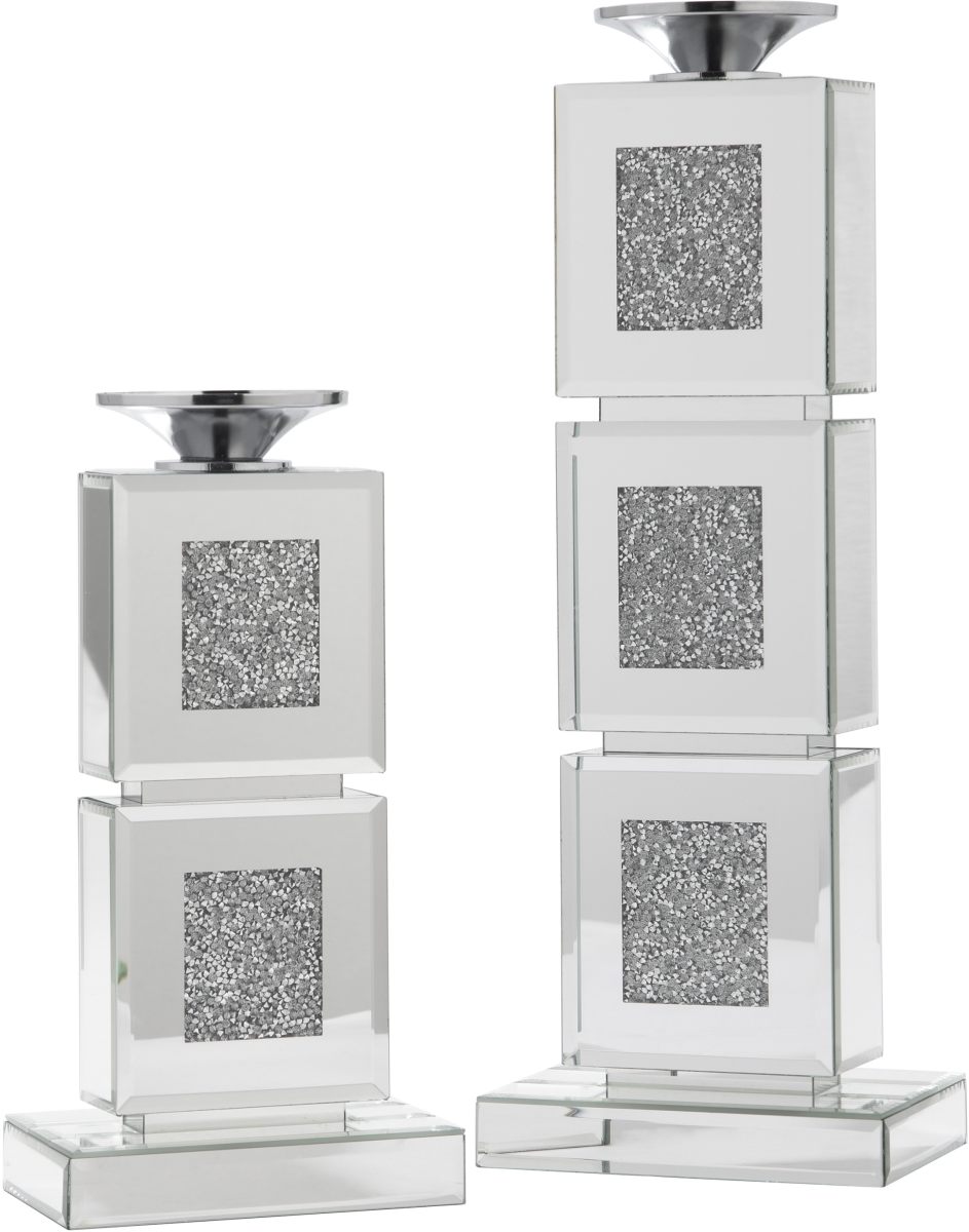Add a touch of glamour to your accent table or mantle with this candle holder set. The cut-glass mirror base embellished with silvertone beaded accents will keep the candlelight dancing for hours.Read More
