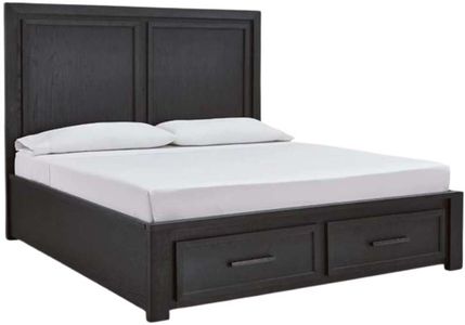Includes California king panel headboard, storage footboard, and rails with roll slats