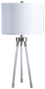 This Idalia table lamp features clear, acrylic, tripod legs with chrome-tone accents and a white fabric drum shade.