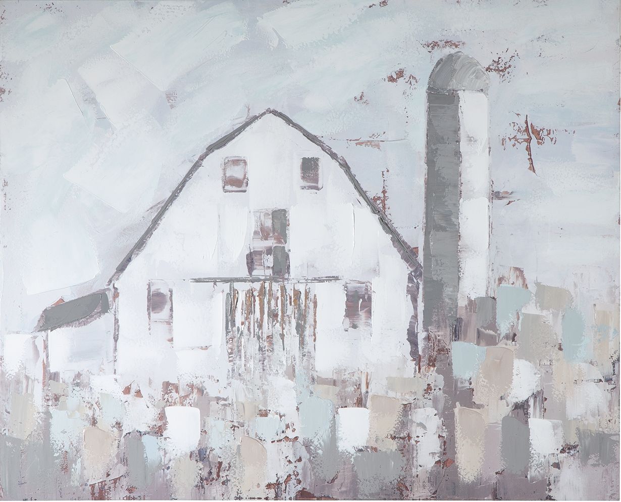 The Jumana, hand-embellished wall painting of a countryside barn shows off your folksy side. The art is on unframed gallery-wrapped canvas and features an easy-mount, D-ring hanger.