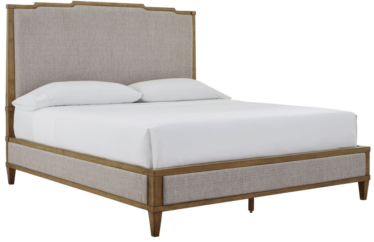 Taking a timeless approach to bedroom beauty, this queen upholstered bed brings easygoing elegance to the everyday. Softly upholstered in a neutral hue, it seamlessly slips into your room’s aesthetic. Adding to its fresh approach to transitional stylings: a chic wood frame and staggered detailing on the headboard.Read More