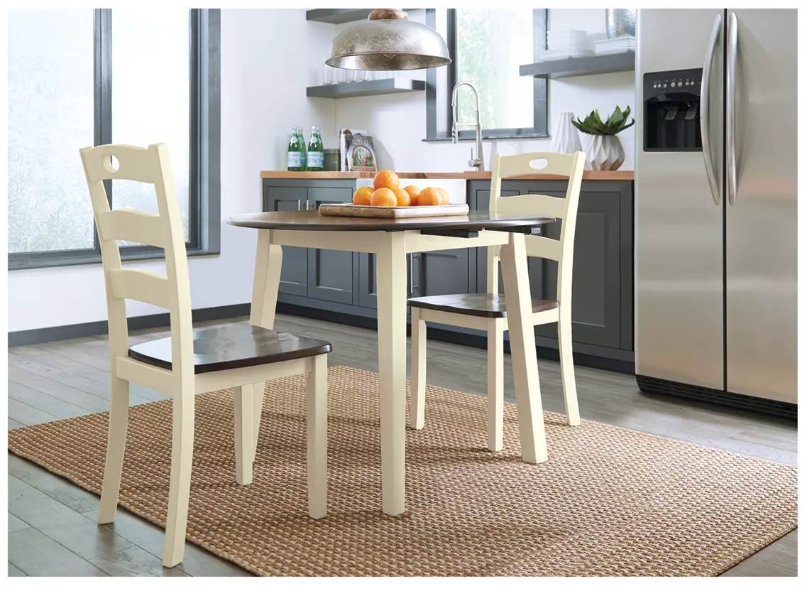 Use this round drop leaf table to turn your eat-in kitchen or dining room into a cottage-chic retreat. Two-tone finish provides a double charm aid. Cottage-chic retreat provides a double charming help with this dining room side chair. Equally cute and advanced is the pierced ladderback design.